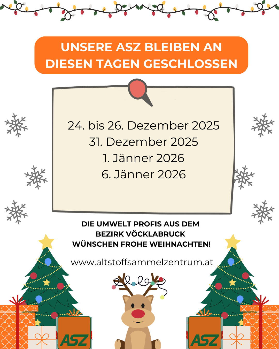 ASZ ÖFFNUNGSZEITEN AN DEN WEIHNACHTSFEIERTAGEN 2025/2026